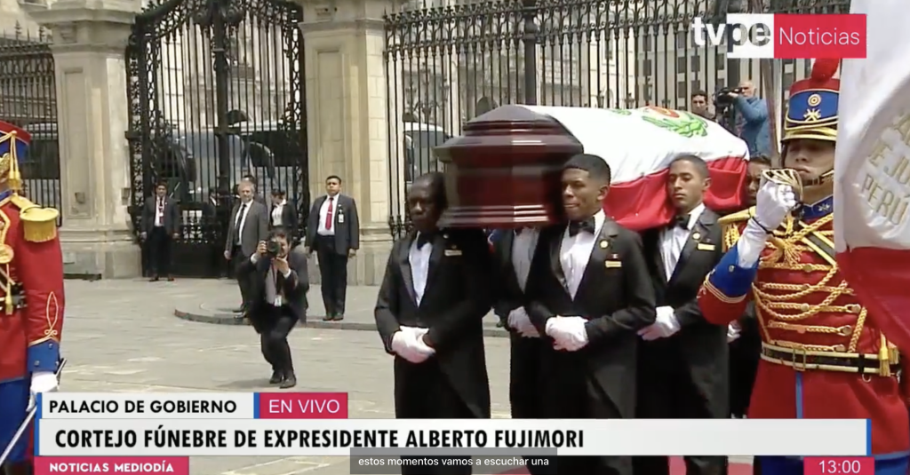 La presidenta de la república, Dina Boluarte Zegarra, le rinde los altos honores al expresidente Alberto Fujimori. Junto a la familia del exmandatario, liderado por keiko Fujimori, la mandataria le rindió las condolencias a sus seres queridos.