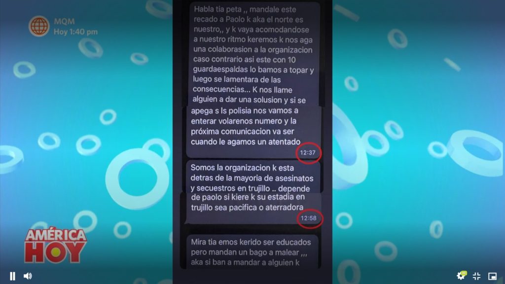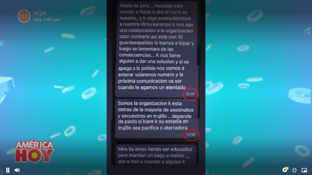 “Que nos llame, y si llama a la policía, la próxima comunicación que tendremos es cuando le hagamos un atentado. Somos la organización que está detrás de la mayoría de los asesinatos en Trujillo”