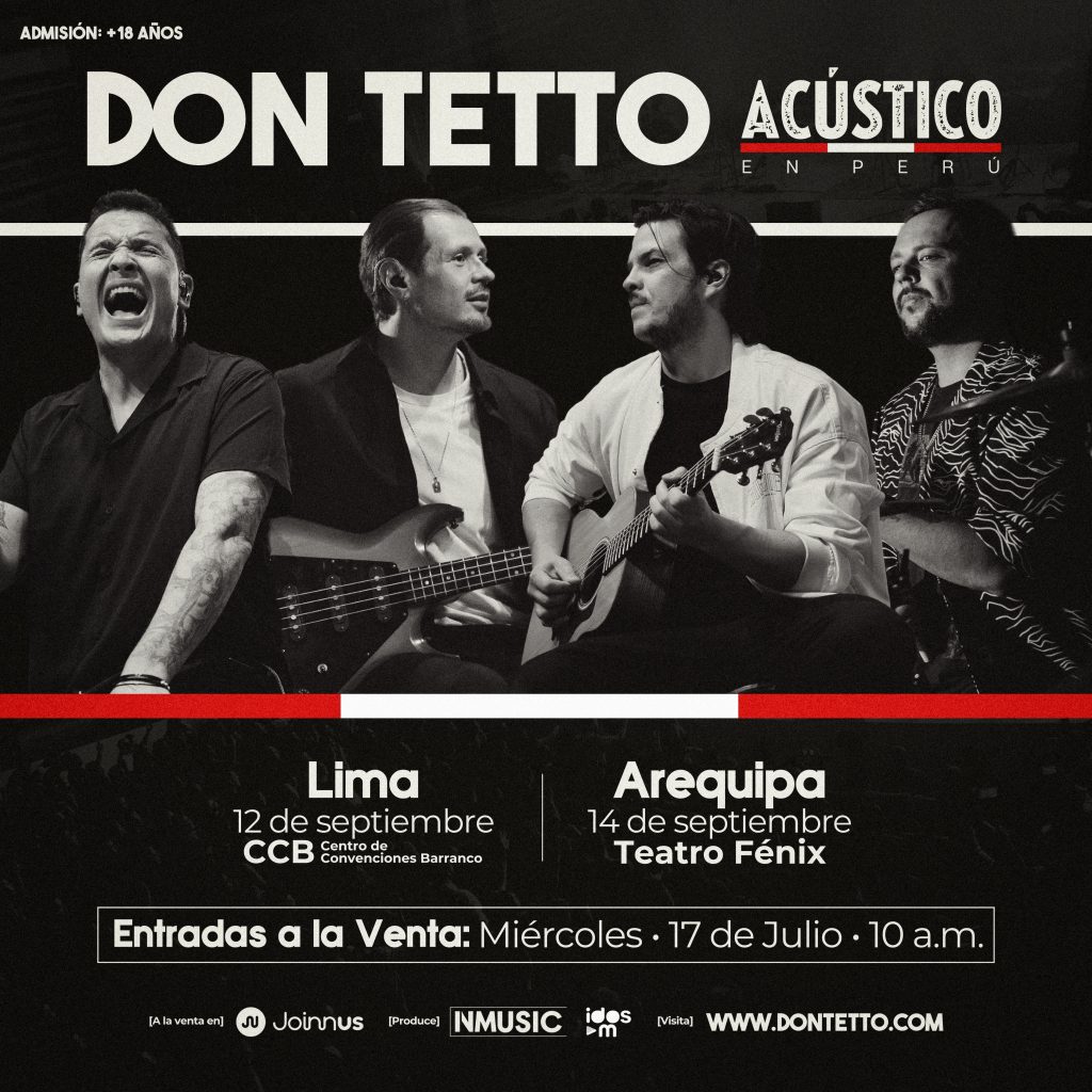 Don Tetto una de las bandas de rock más sobresalientes de Latinoamérica, se alista para brindar dos conciertos en nuestro país y presentar ¨Acústico¨, un show íntimo y exclusivo de su nuevo tour mundial. Su primera presentación se llevará a cabo el 12 de setiembre en el Centro de Convenciones Barranco y el 14 del mismo mes en el teatro Fénix en Arequipa. Las entradas para ambos shows ya están a la venta en Joinnus.com.