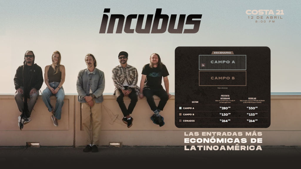 Un verdadero revuelo ha causado la llegada de Incubus a nuestro país. Este jueves se inicia la preventa de entradas para el show que brindará la banda de rock alternativo, el próximo sábado 12 de abril en Costa 21 de San Miguel. Masterlive en un esfuerzo sin precedentes ha conseguido que los boletos que se pondrán a la venta a partir de las 10:00 am en Teleticket sean los más económicos de la región.