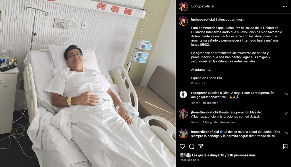 Las buenas noticias tras este penoso incidente llegan y ahora el artista ya salió de cuidados intensivos. ¨Lucho Paz ha salido de la Unidad de Cuidados Intensivos ya que su evolución ha sido favorable. Actualmente se encuentra estable con las atenciones que america su estado y permanecerá internado hasta mañana ( lunes)¨, reza la misiva que fue colgada en las cuentas oficiales del artista.