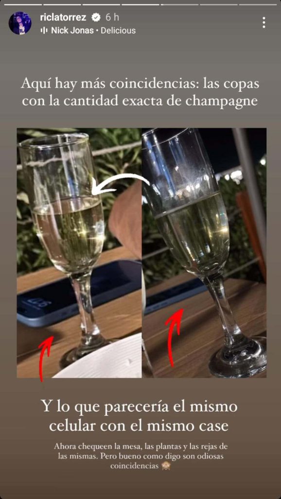 La primera es que ambos subieron la historia a la misma hora en el mismo lugar. No obstante, también se pueden visualizar las copas de champagne, las cuales tienen la misma cantidad de licor.