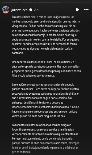 En el comunicado, Zucchi reconoce que los medios han puesto su vida personal en el centro de atención en los últimos días, especialmente después de que la madre de sus hijos afirmara públicamente que le fue infiel en Argentina.