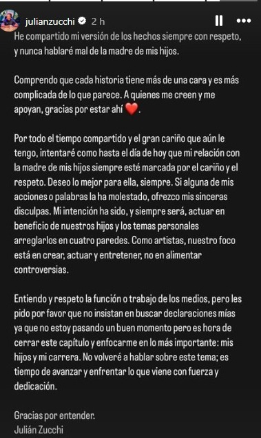 Por último, Zucchi solicita a los medios de comunicación que no busquen más declaraciones suyas sobre este tema, ya que prefiere enfocarse en lo más importante: sus hijos y su carrera. Concluye su comunicado agradeciendo a quienes lo comprenden y apoyan en este difícil momento.