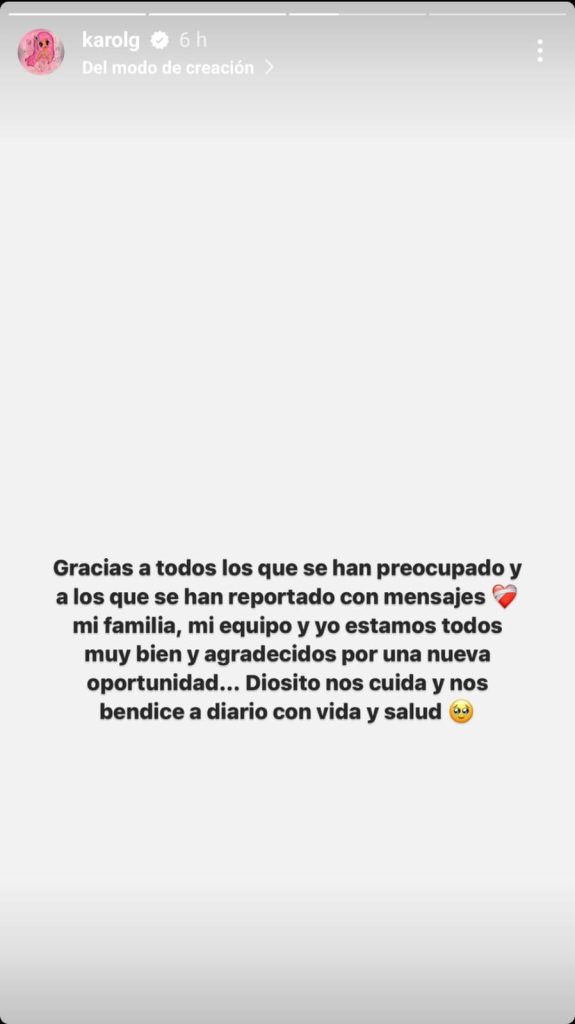 “Gracias a todos los que se han preocupado y a los que se han reportado con mensajes. Mi familia, mi equipo y yo estamos todos muy bien y agradecidos por una nueva oportunidad. Diosito nos cuida y nos bendice a diario con vida y salud”, finaliza Karol G.