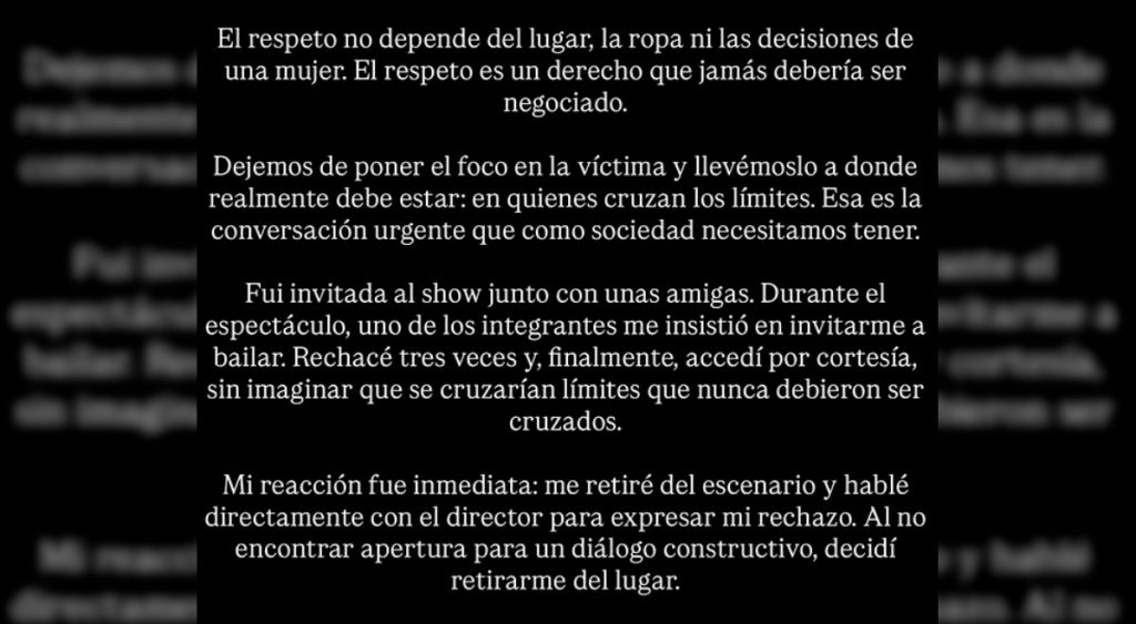 Su declaración también respondió a algunos comentarios en redes que criticaban su presencia en un evento considerado como dirigido a “mujeres solteras”. Ella fue enfática al señalar que ningún contexto justifica la transgresión de los límites personales.