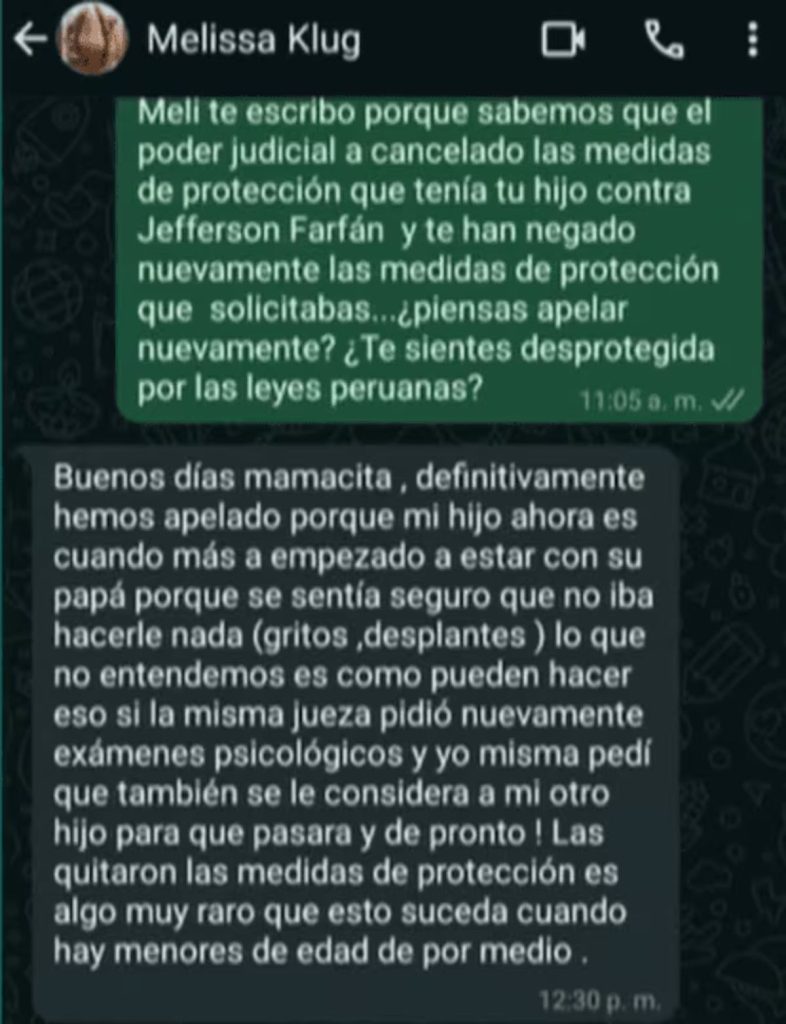 El Juzgado de Familia ha denegado las medidas de protección solicitadas por Melissa Klug para ella y su hijo mayor contra el exfutbolista Jefferson Farfán, lo que ha generado una contundente respuesta por parte de la empresaria. Además, la popular  ‘Blanca de Chucuito’, reveló supuestos abusos que su hijo habría sufrido por parte de su padre, lo que motivó su solicitud de protección.