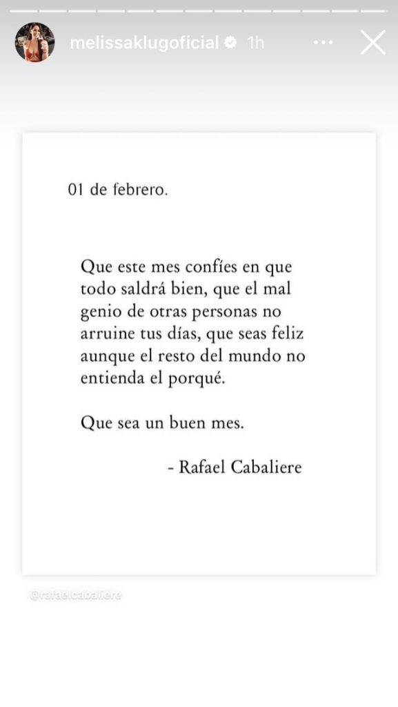 Luego de unos días en que Melissa Klug diera por finalizada la relación con el futbolista Jesús Barco, la empresaria despierta este mes de febrero con una fuerte reflexión.