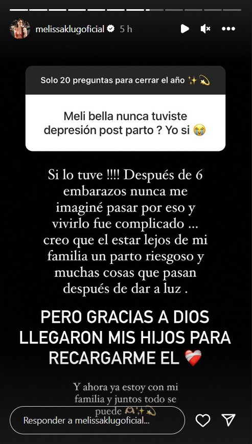 Melissa Klug decidió realizar una dinámica por medio de su cuenta de Instagram, donde le pidió a sus seguidores hacerle 20 preguntas. Entre estos cuestionamientos resaltaron dos, los cuales eran conocer si aún mantenía una relación con Jesús Barco y si había padecido de depresión postparto.