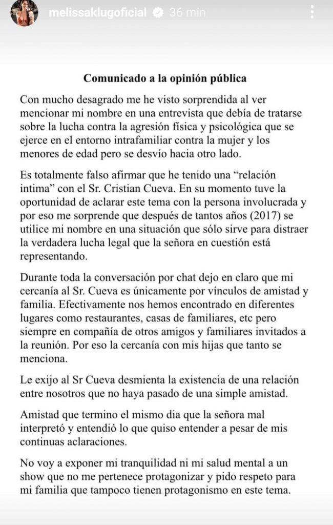 MELISSA KLUG EMITIÓ UN COMUNICADO TRAS SER RELACIONADA CON CHRISITAN CUEVA