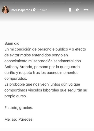 Melissa Paredes sorprendió este viernes al publicar una contundente historia de Instagram. La modelo y actriz anunció el fin de su relación con el bailarín Anthony Aranda.