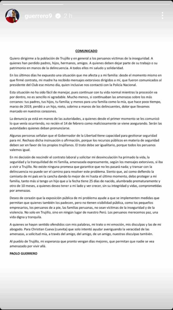 Paolo Guerrero se encuentra en el ojo público, luego de que revelara que desea rescindir su contrato con la UCV. El futbolista, alegó que su decisión se debía a un motivo de fuerza mayor, ya que su madre había recibido amenazas de extorsionadores, los cuales condicionaban su estadio en Trujillo a través de dinero.