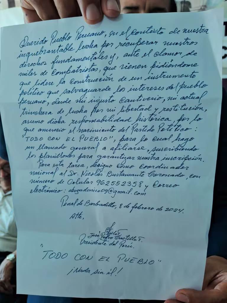 En febrero del presente año 2024, el periodista Martín Sarmiento de La Mula, difundió una misiva donde Pedro Castillo, anunciaba la creación del partido político ‘Todo con el Pueblo’ desde el penal de Barbadillo.