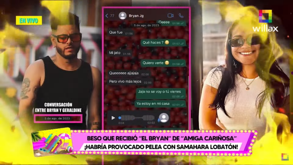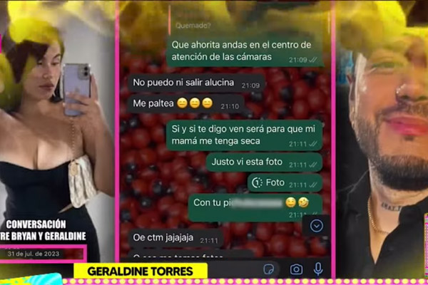 Geraldine ha mostrado chats donde se evidencia la calentura de las conversaciones entre ella y Bryan. En uno de los mensajes, Geraldine le dice a Bryan que quiere verlo y él responde de manera sugerente. Otro mensaje muestra a Bryan llamando a Geraldine «malcriada» y bromeando sobre su período menstrual y sus partes íntimas, lo que sugiere una complicidad entre ambos.