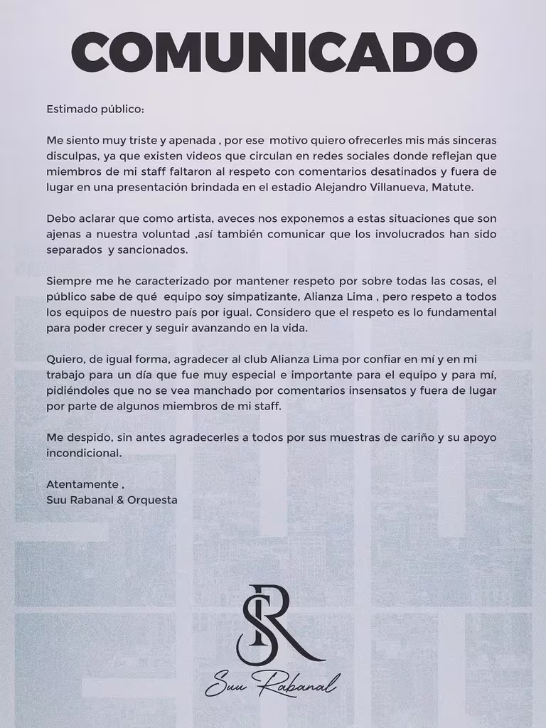 En respuesta a la controversia, Suu Rabanal ofreció disculpas públicas a través de sus redes sociales, expresando su tristeza y arrepentimiento por el comportamiento inapropiado de sus colaboradores. Aclaró que, aunque como artista no siempre puede controlar las acciones de su equipo, el respeto es fundamental en su carrera. La cantante reafirmó su apoyo a Alianza Lima y destacó que, a pesar de sus simpatías personales, mantiene un respeto equitativo hacia todos los equipos del país